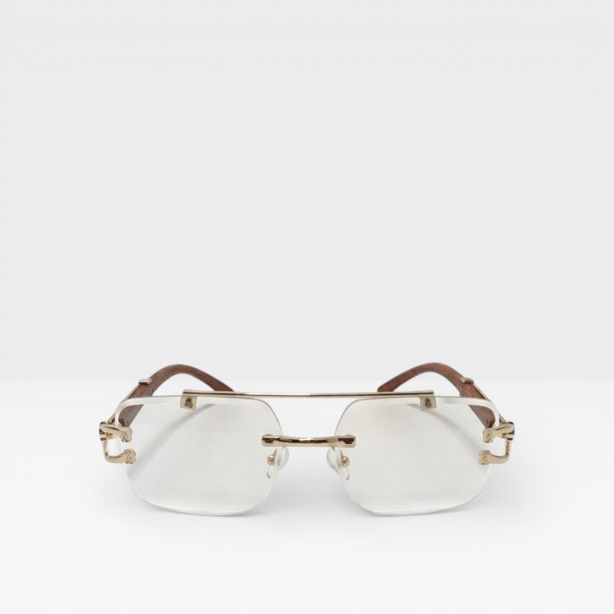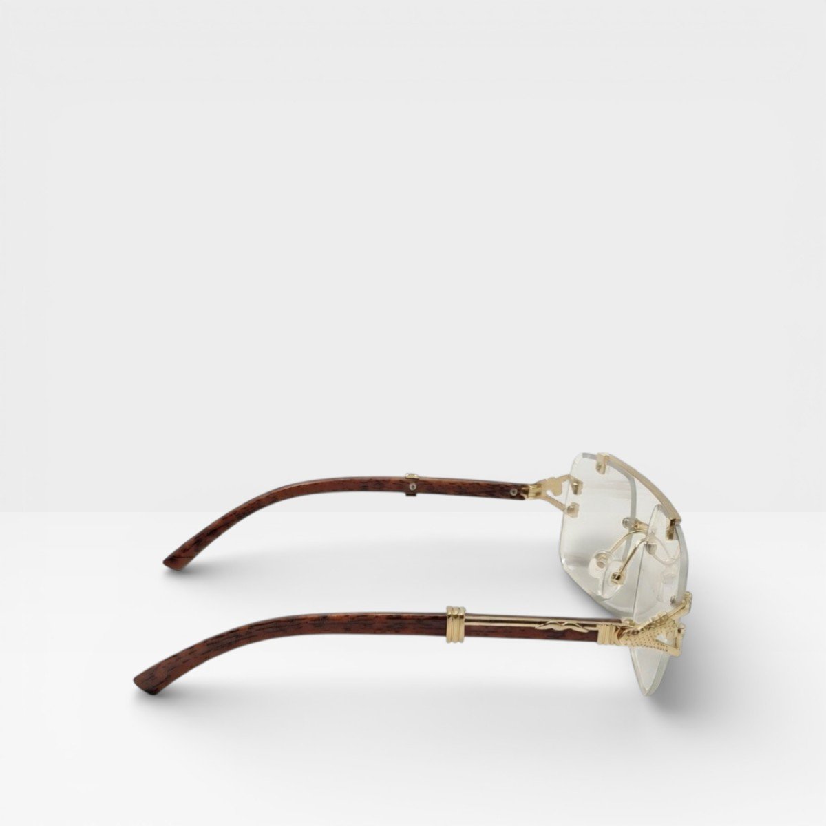 Rimless design meets luxurious wood-gold accents, creating Glasses that don’t just complement your look—they define it. Minimalist, bold, and effortlessly eye-catching, these are the shades for those who dare to stand out.